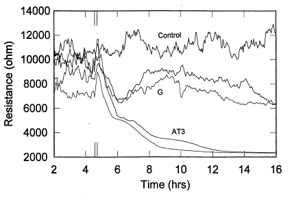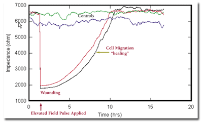 典型的損傷修復(fù)實(shí)驗(yàn)如下圖所示。BSC1細(xì)胞首先長成單細(xì)胞層,然后兩個(gè)孔中給予點(diǎn)擊,使測量電極上的細(xì)胞死亡,引起阻抗值降低。隨時(shí)間的延長這兩個(gè)曲線又回到初始數(shù)值,這是由于那些在電極外的正常細(xì)胞向損傷地區(qū)遷移并重新生長并且替換已死去細(xì)胞。