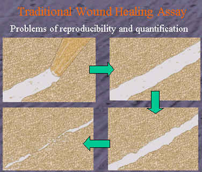 傳統(tǒng)的細(xì)胞損傷修復(fù)實(shí)驗(yàn)一般使用生長增殖快的單細(xì)胞層,然后在細(xì)胞層上劃一條線,小面積的細(xì)胞層被損傷。當(dāng)周圍細(xì)胞進(jìn)入并且生長填滿被損壞的區(qū)域時(shí)(修復(fù)),可以用顯微鏡檢查到損壞的區(qū)域里的細(xì)胞狀況。